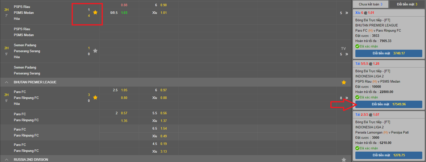 Nếu hệ thống đã chấp nhận đơn cược đổi tiền mặt sớm, hội viên sẽ không thể hủy giao dịch đã đổi tiền mặt. Số tiền đã đổi tiền mặt sớm thành công sẽ được chuyển về tài khoản hội viên theo phương thức kết toán. Và đơn cược này sẽ không bị ảnh hưởng bởi kết toán cuối cùng của trận đấu và kết quả của trang chủ giải đấu.